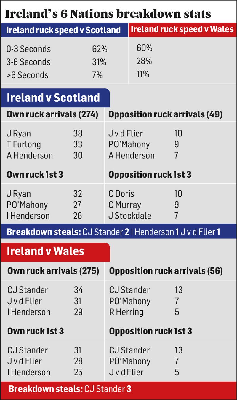 Drilling down a little further, the Scotland game saw James Ryan and Iain Henderson, along with prop Tadhg Furlong, get to more rucks in which Ireland were in possession with the two Irish secondrows and flanker Peter O'Mahony among the first three players to arrive more often than any of their team-mates.