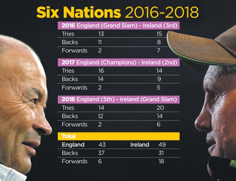 Jones was appointed England coach in November, 2015. So using the parameters of the Six Nations championships of 2016, 2017 and 2018 with a view to the respective try tallies of England and Ireland during the tournaments in question, Joe Schmidt's side comes out on top with a cumulative total of 49 tries to 43.