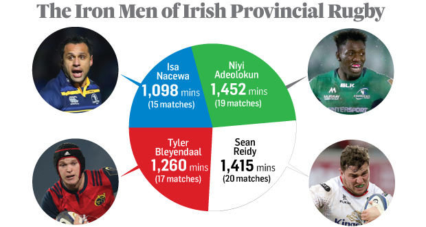 They represent the iron men of Irish provincial rugby, the players who have compiled the most minutes for Connacht, Ulster, Munster and Leinster to date in the 2016-2017 season. The player who leads the way might come as something of a surprise, Connacht's flying wing Niyi Adeolokun.