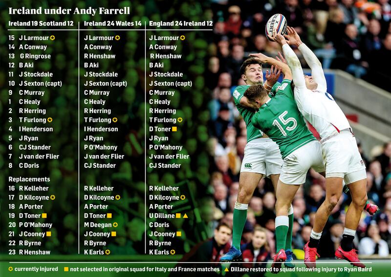 Larmour’s absence requires a change at fullback and once Farrell identifies his choice then it will inform those of the two wings. Andrew Conway and Jacob Stockdale are currently in situ on the wings. Leinster’s recent preference was to play Keenan at fullback with Larmour switching to the wing and that may be replicated in the national side.
