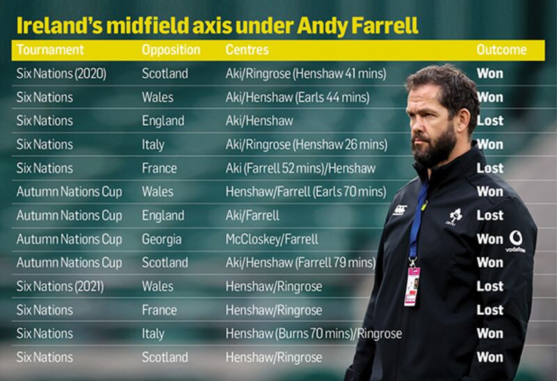 As the graphic demonstrates the Irish coach has operated with a pool of five centres in his 13-game tenure with Chris Farrell and Stuart McCloskey making up the quintet alongside Aki, Henshaw and Ringrose. Ireland have lost their last four games against Eddie Jones' teams since the Grand Slam defining performance at Twickenham in 2018.