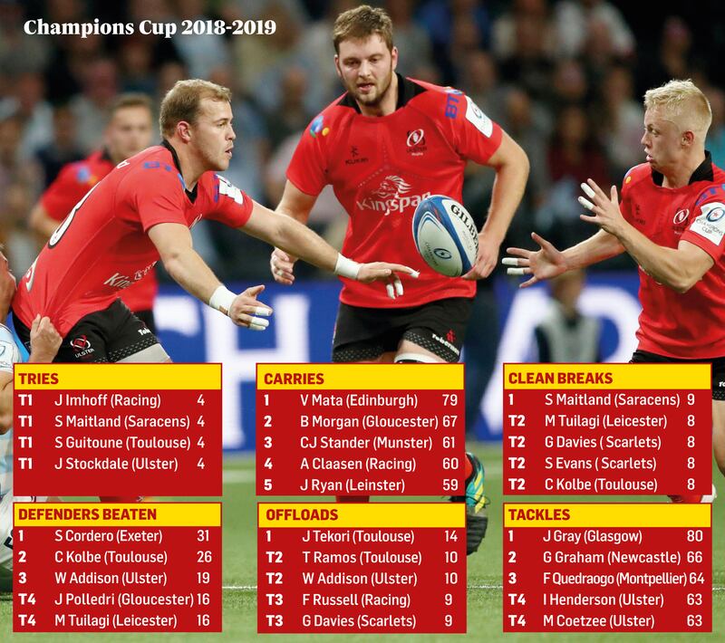 It's a clumsy segue to the fact that two Ulstermen Iain Henderson (63), sadly absent through injury and Marcell Coetzee (63) make the top five in the tackle category. The only Irish international who features in two categories is Will Addison and Ulster will be hoping that he can improve those figures come Saturday afternoon in what promises to be a cracking Champions Cup weekend.