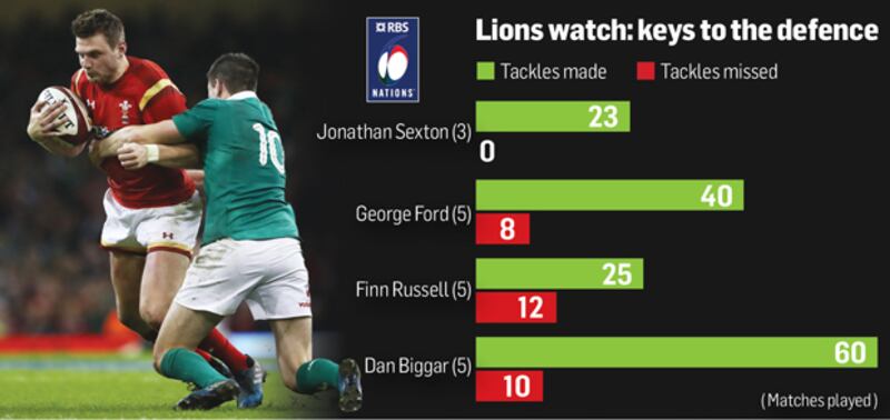 Scotland’s Finn Russell tackling is significantly below his rivals, with a completion rate of 25 from 37 tackles, or 68 per cent. So Gatland must weigh up the creativity that the outhalves bring to the patterns he wants to play plus their contribution in defence when choosing the outhalves to travel to New Zealand.