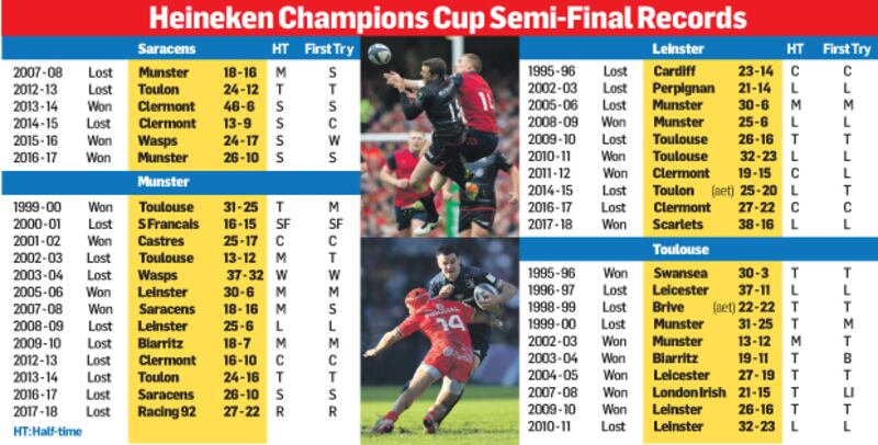Toulouse are the only club who can boast a winning record at the penultimate stage of the European Cup having won six of 10 semi-finals, Saracens break even (3-3) in terms of their six, while Leinster (four wins in 10) and Munster, four wins in 13, will be hoping to improve those respective figures.