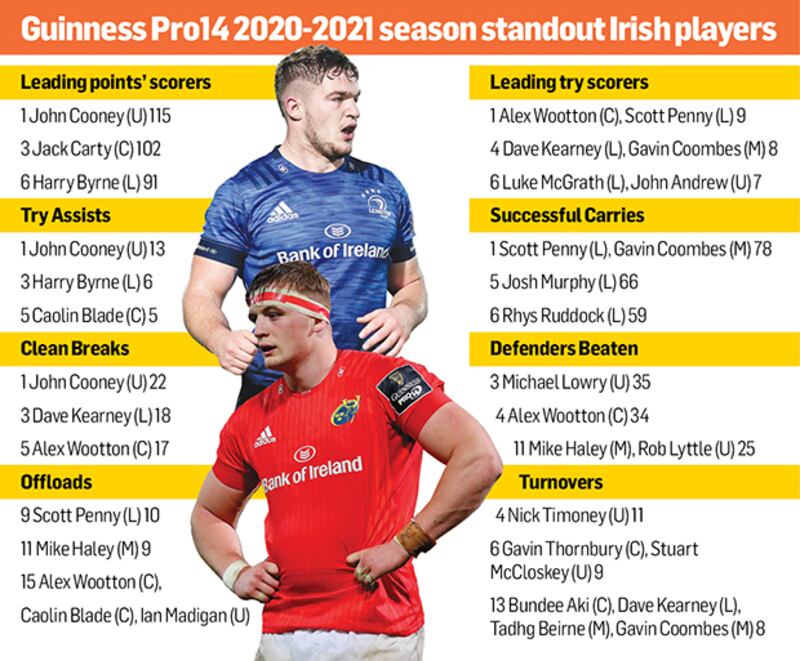 As the graphic illustrates, Gavin Coombes, has been an outstanding contributor to the Munster cause this season and a standout from an Irish perspective in the league. He is joint top of the 'successful carries' category (78), along with Leinster's Scott Penny and also features prominently in the try scoring (eight) and turnovers (eight) metrics. The statistics complement the evidence of performances.