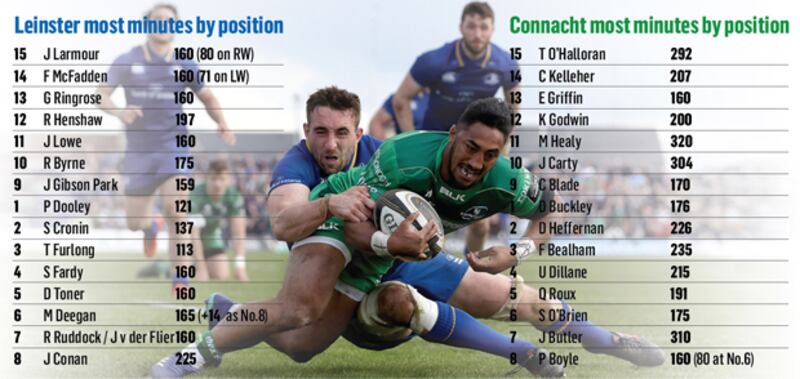 As a comparison the column examined the players who had racked up the most minutes by position in competitive matches this season for Leinster and Connacht, and as the graphic illustrates in a few cases there is an addendum recognising additional game time in a different position.