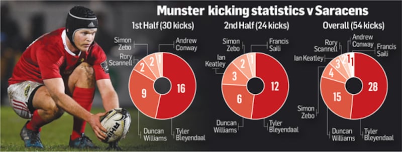 First and foremost, Munster's kicking in the first half was largely well-directed by halfbacks Duncan Williams and Tyler Bleyendaal. There were a couple of exceptions, Williams over-cooking a box-kick and offering an easy catch for Saracens number eight Billy Vunipola and Bleyendaal's smothered punt travelling into the hands of a defender less than 15 metres away.