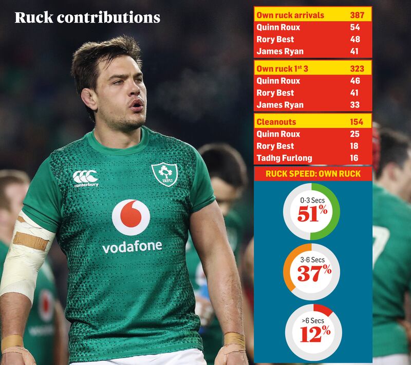 Ireland racked up a figure of 387 under the "own ruck arrivals" moniker – it signifies the number of Irish players to contest a ruck in which Ireland had possession – with Roux leading the way on 54, closely followed by his captain, Rory Best (48) and Ryan (41). To put that in context the leading Scot, prop Simon Berghan managed 36 from a total of 279.