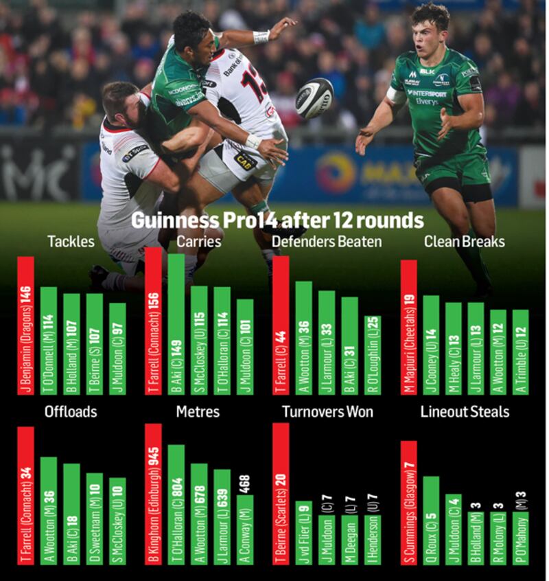 For the purposes of the graphic, the leading player in each of the eight categories is shown in red and is then followed only by Irish internationals or Irish qualified players and doesn't include for example Ulster's former All Black Charles Piutau, who features prominently in several categories.