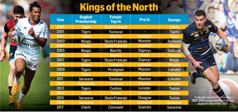 The Irish province still have the not-inconsiderable task of trying to beat their Parisian opponents, who were the 2016 Champions Cup runners-up, losing to Saracens in the final. There is a hefty chunk of the period illustrated in the graphic in which a clean sweep of champions wasn’t possible simply because clubs won successive European titles.