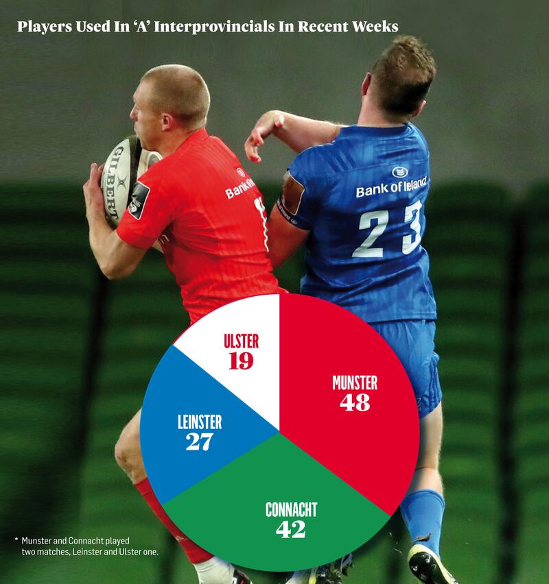 By virtue of the fact that Leinster and Ulster made the quarter-finals of the Champions Cup, their recent A interpro at the RDS, was contested largely by the players who hadn't been on duty – the Ulster trio of Matt Faddes, Kieran Treadwell and Ross Kane exceptions – in those European ties. Leinster gave game time to 27 players at the RDS, Ulster 19 in a match the visitors won 29-14.