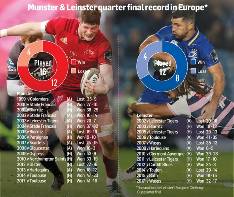 Leinster have won eight of 12 quarter-finals, six out of seven at home (85.71 per cent), two of five (40 per cent ) away – the tournament win ratio for teams at home in quarter-finals is 77 per cent – while their only defeat in Dublin came against the Leicester Tigers in the 2004-2005 season.