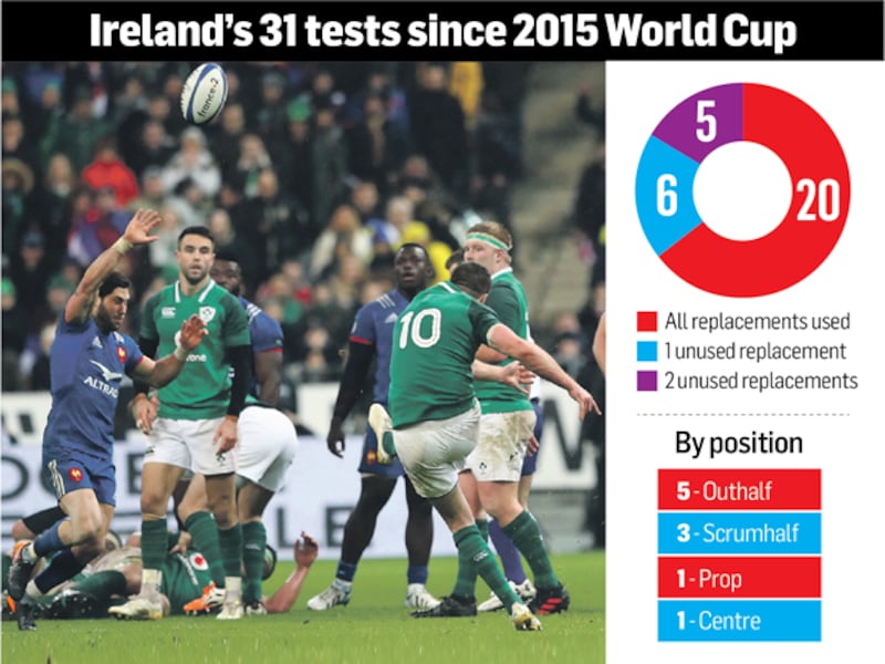 On 20 occasions in 31 matches, Ireland head coach Joe Schmidt has used all eight replacements while at the other end of the scale there are five games in which two players didn't get a minute and four of those relate to the replacement halfbacks.