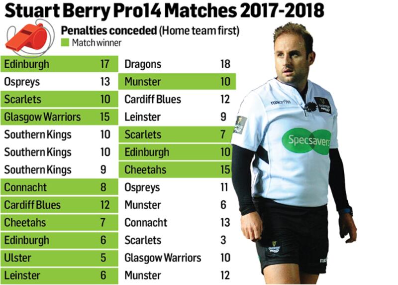 Berry has refereed Saturday's Pro14 finalists on five occasions this season. The South African took charge when the Scarlets beat the Cardiff Blues 30-17, when the Welsh club scraped past the Southern Kings 34-30, and also in their 52-14 defeat to Edinburgh at Murrayfield. Leinster's record under Berry is balanced at 1-1, losing 31-21 to the Glasgow Warriors in Scotstoun while sneaking past Munster 16-15 in last weekend's semi-final.