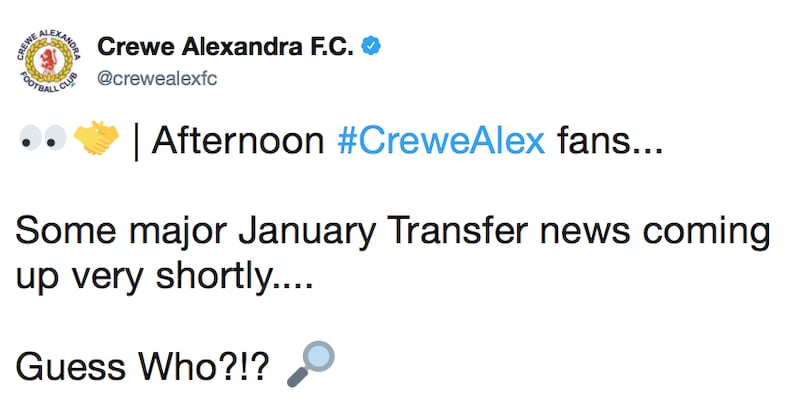That’d be whoever was running Crewe Alexandra’s Twitter account last Thursday and sent the club’s beleaguered fans in to a tizzy by tweeting…..