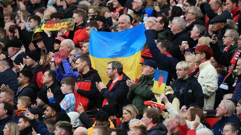 Just prior to kick-off, the teams gathered together to hold up a sign displaying the word ‘Peace’, following Russia’s invasion of Ukraine, while many Ukraine flags could be seen in the crowd.