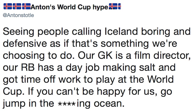 “You can’t help but love Iceland, we haven’t attacked anyone, been to war with anyone. We only had the cod wars and no one got hurt there. It’s a pretty little nation, and pretty people in general.” – Iceland coach Heimir Hallgrimsson. Mind you, Argentina probably aren’t feeling the love.