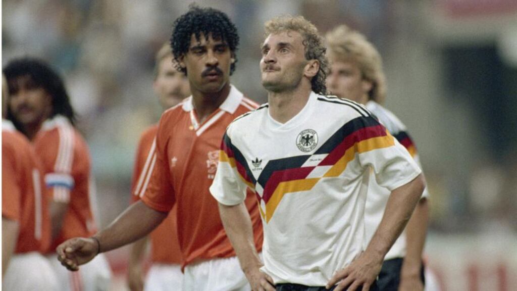 The snap in question? Rudi Völler standing in thoughtful meditation with his hands on his hips in the immediate aftermath of one of the most unjust dismissals in World Cup history, while over his right shoulder, his Dutch rival Frank Rijkaard looks to be inspecting the massive golly he had just violently expectorated and left dangling from the back of the German striker's perm like a Christmas tree bauble.