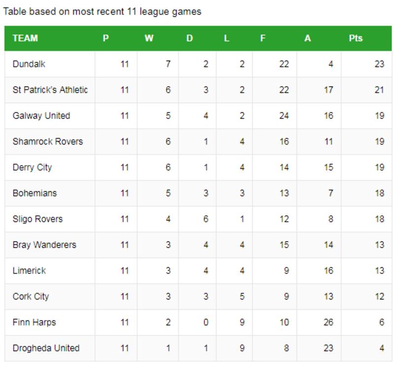 At that stage they had an incredible 64 points from 66 and their lead at the top of the table already looked unassailable. It is just as well. They have taken nine from 30 since and in a table based on every club’s last 11 games, a sequence that started for them with a win, they would sit 10th, in a relegation spot, with just 12 points and fewer goals scored than the team immediately below them, Finn Harps.