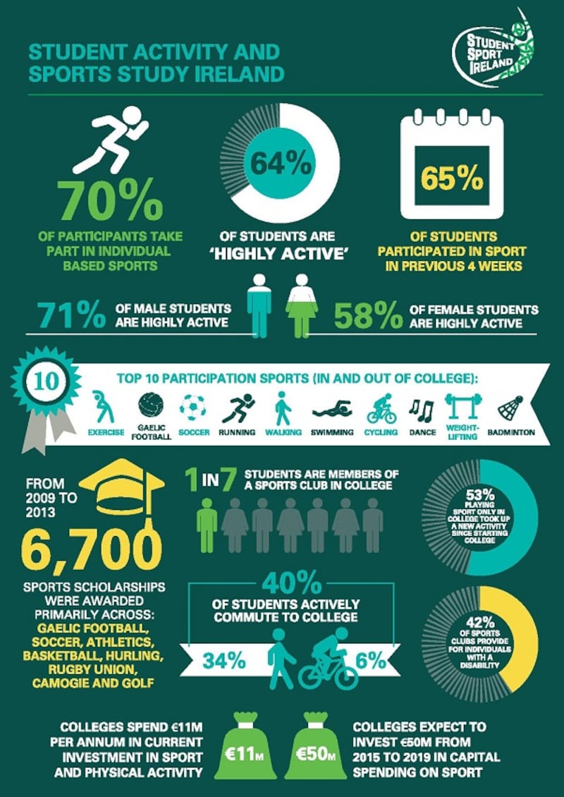 Chairperson of Student Sport Ireland Ms Carmel Lynch, said: "While we are encouraged by the high level of participation and activity, there are areas which are highlighted in the report that Student Sport Ireland and member colleges can work together to address such as the provision of facilities and programmes for students with a disability, initiatives to develop active commuting and gender balance in supporting our high performing athletes".