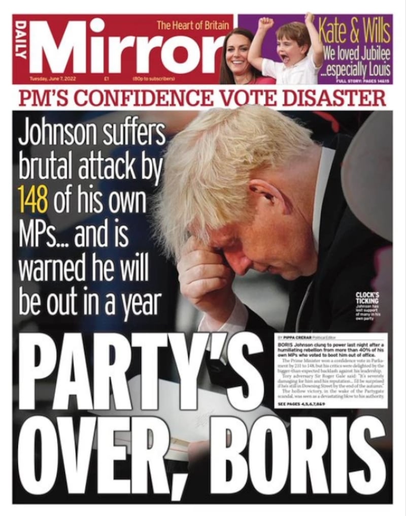 The Daily Mirror leads with “Party’s Over, Boris” and says “Johnson suffers brutal attack by 148 of his own MPs ... and is warned he will be out in a year”.