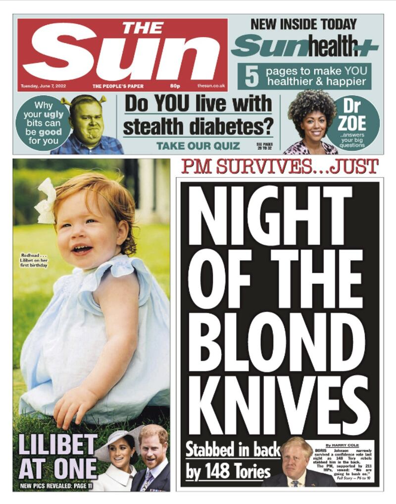 The Sun’s front page describes last night’s vote as “Night of the blond knives” and says the British PM was “stabbed in [the] back by 148 Tories”.